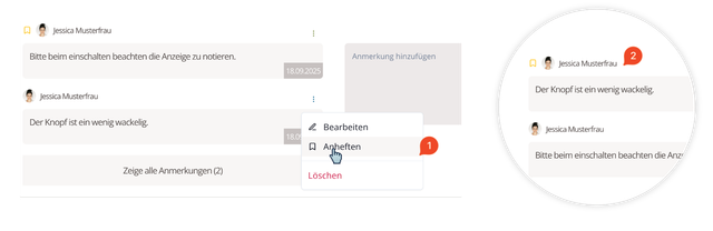 Tipp: Angeheftete Kommentare werden neben dem Avatar mit einem Icon markiert (2).