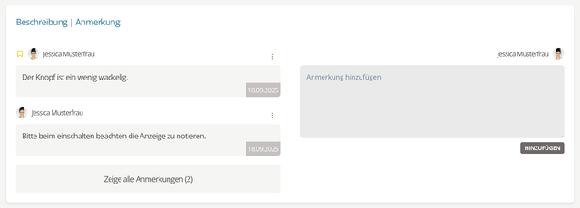 Eine vollständige und nahtlose Dokumentation umfasst auch die Aufzeichnung von Reparaturen und Wartungen am Prüfmittel. Für eine lückenlose Gerätehistorie können unter Beschreibung | Anmerkung jederzeit Einträge vorgenommen werden. Diese Einträge werden nach Datum abgsteigend geordnet beim Prüfmittel angezeigt. Mit der Zeit entsteht so eine chronologische Dokumentation zu jedem Prüfmittel.