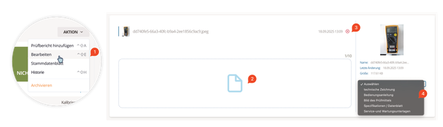 Klicken Sie zuerst auf das Aktions-Menü und dann auf Bearbeiten (1). Alternativ können Sie auch einen Hotkey benutzen, um in den Bearbeitungsmodus zu gelangen. Laden Sie nun alle sonstigen Dokumente hoch, die für Sie zu einer vollständigen Prüfmitteldokumentation gehören (2). Ziehen Sie Ihre Dokumente in diese Ablage hinein oder klicken Sie in die Mitte der Ablage.