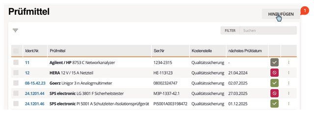 Mit dem Button HINZUFÜGEN (1) kann ein neues Prüfmittel zu Memida hinzugefügt werden. Nach einem Klick öffnet sich die Seite zum Hinzufügen von Prüfmitteln.