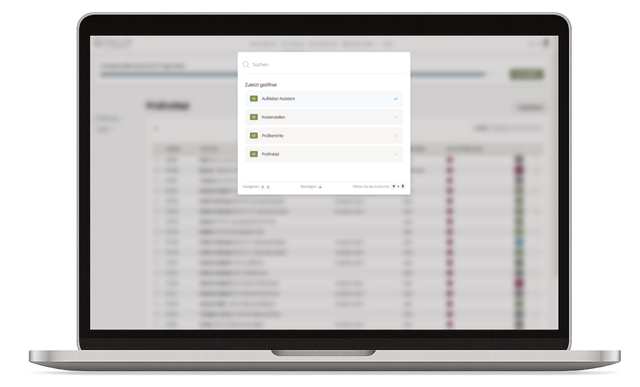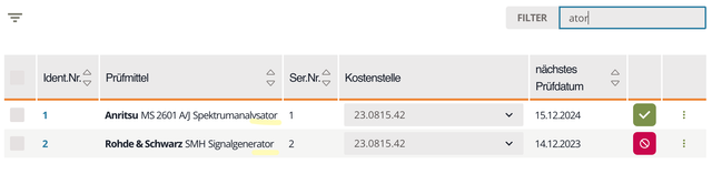 Use the global search to look for inspection equipment, users, or cost centers. The best matches appear in a list view.