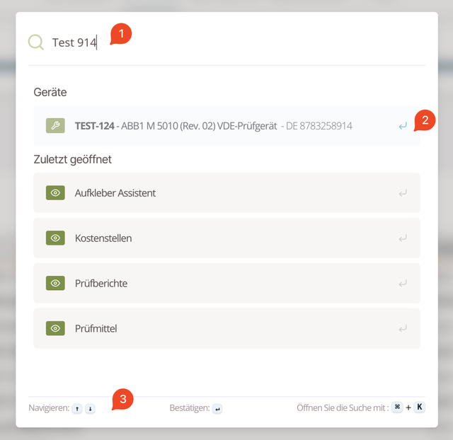 Fig. 2: Search results As soon as you type (1), the search suggests potential results (2). Results are grouped by type. Navigate the list with the arrow keys (↑/↓) (3).